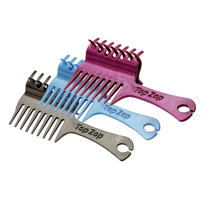 Clevere Einflechthilfe, Kunststoff-Kamm mit angebauter Greifklammer zum Fest- und Fernhalten der Mähne, mit Vorrichtung am Griff für das Halten von Einflechtgummis.